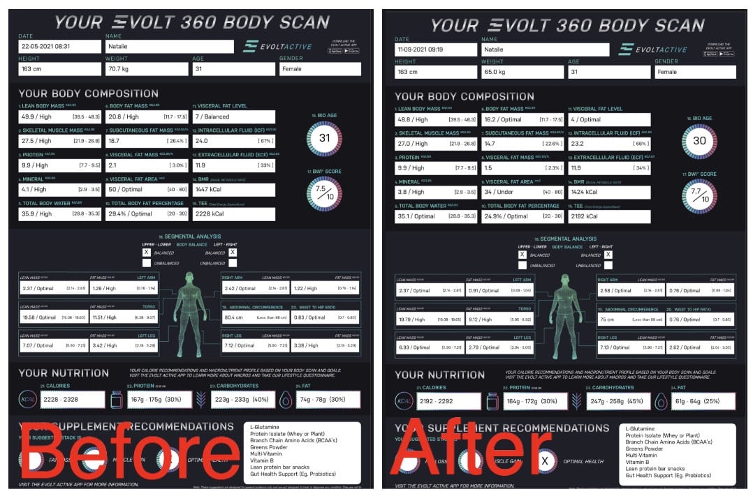 Natalie lost a total of 5kgs during the challenge, which went from 22 May 2021 through to 11 September 2021, and the unit measurement results listed below from her Evolt 360 scan were amazing!